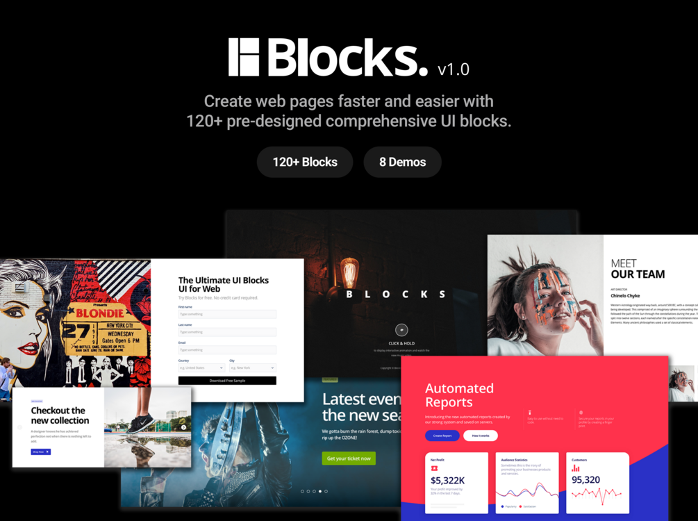 Create web pages in minutes with Blocks UI Kit for desktop. Blocks is a set of 120+ pre-designed comprehensive UI blocks based on symbols to help designers and developers create web pages easier and faster.
